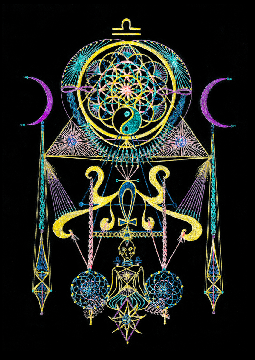 Libra’s song begins in the rose of the Flower of Life ~ a sacred Venusian bloom crowning the top of this piece. Here, beauty is not superficial; it is geometry in motion, design as divination. Libra, ruled by Venus in her airy form, seeks symmetry in chaos, elegance in tension + art in everything.