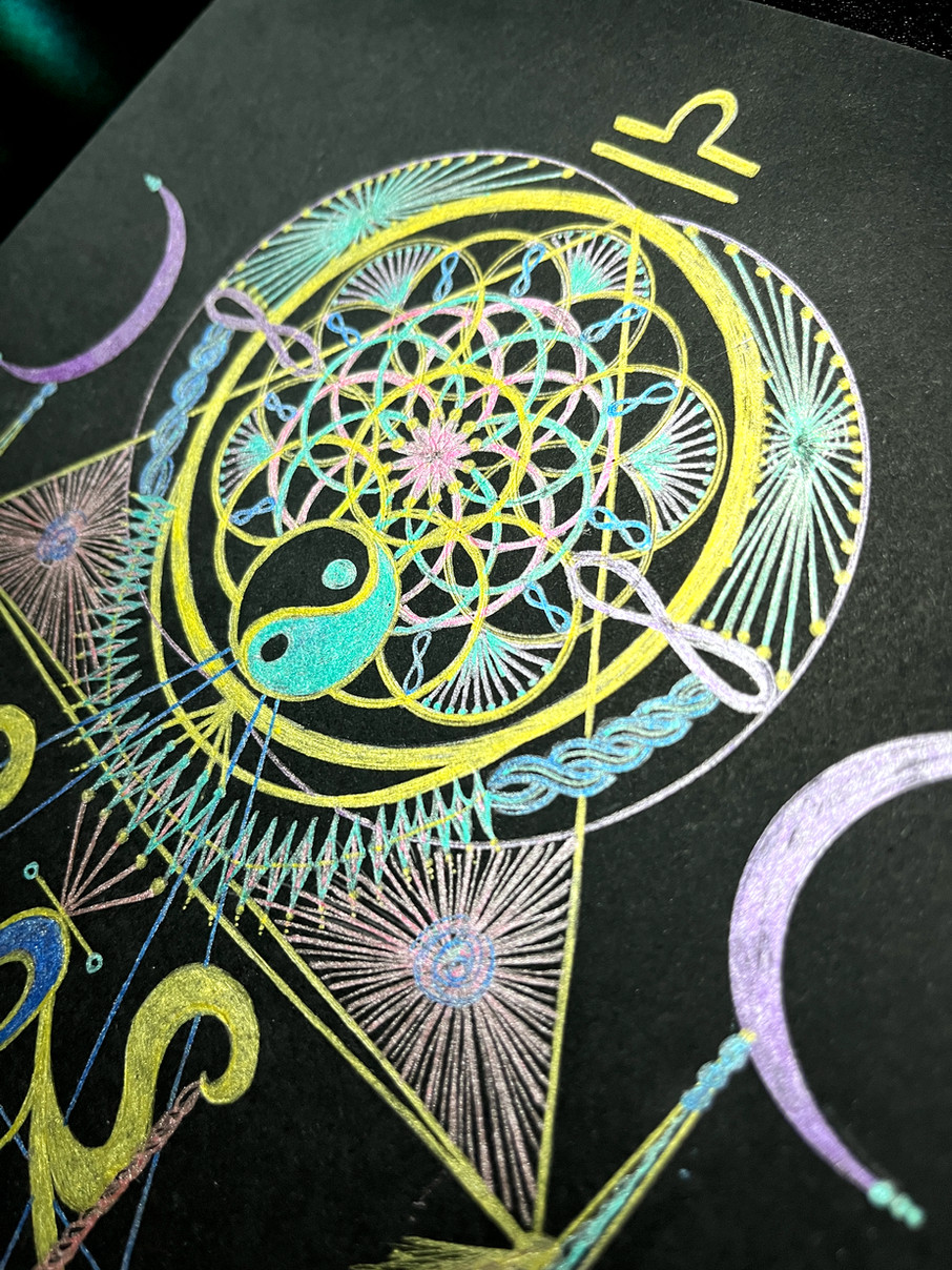 At the core, a yin-yang sits inside the compass of Libra’s circuitry. This is the pendulum of a Libran life ~ moving between polarities not to get lost, but to return with something precious: <<< perspective>>>.