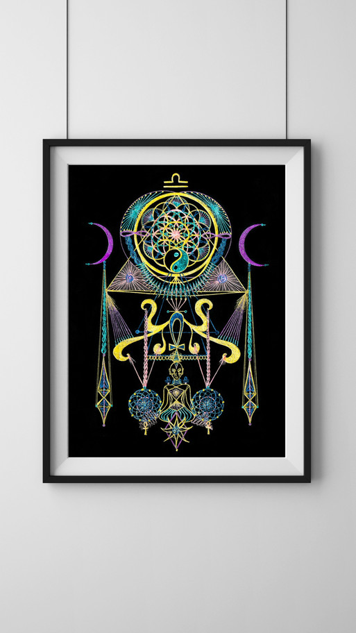 Libra’s song begins in the rose of the Flower of Life ~ a sacred Venusian bloom crowning the top of this piece. Here, beauty is not superficial; it is geometry in motion, design as divination. Libra, ruled by Venus in her airy form, seeks symmetry in chaos, elegance in tension + art in everything.