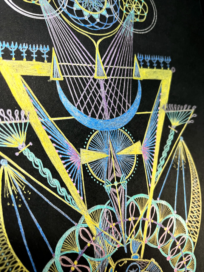 Downward-facing triangles frame the composition ~ the alchemical symbol for water, and the sacred element Pisces swims through. This is the domain of poetry, music, emotion, symbol, < < < surrender > > > . The unnameable forces that help us remember we are not just bones & flesh ~ we are soul, too.